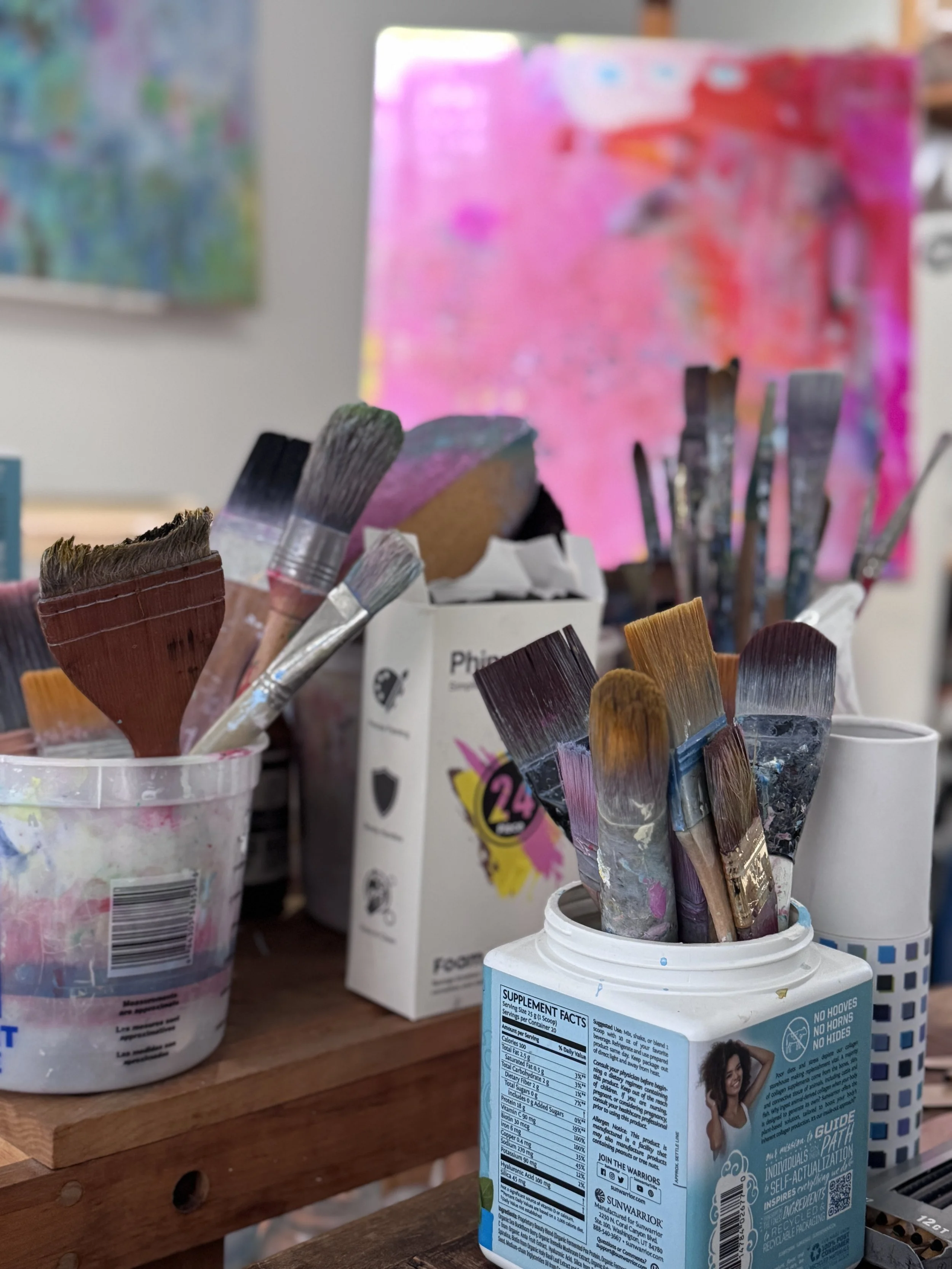 My studio will be open from Noon - 6:00 pm both days. Looking forward to sharing my works in progress, completed works, and having my visitors make their own marks on a collaborative canvas as a way to encourage community.